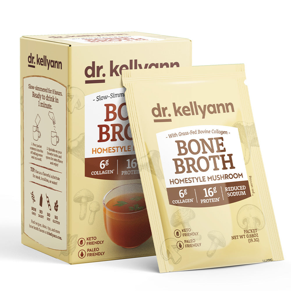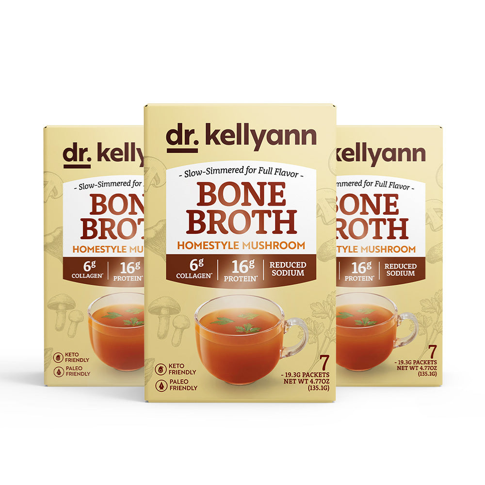 Dr. Kellyann’s Homestyle Mushroom Bone Broth savory flavor was crafted to nourish your body while fitting seamlessly into your daily routine. A thoughtful blend of functional mushrooms including Lion’s Mane, Reishi, Cordyceps, Chaga and Turkey Tail, crafted to support immunity, energy, focus and resilience.